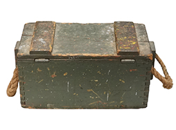 ブレンガン 100連ドラム・マガジン収納木箱です。 100連ドラム・マガジン4本とワインディング・ハンドル(ローディング・ツール)などを収納するための木箱で、本品は収納木箱のみで内容物はありません。 箱には傷や擦れ、再塗装の跡が見られ、本来木箱正面に書かれていた「CHEST EQUIPMENT BREN 100RD. MAGAZINE MK.I」のステンシルは確認出来なくなっています。 蓋の裏面に貼付されたブレンガンへの取り付けや装弾方法を示した紙にも破れやグリス染みがかなり見られ、内容の判別は難しくなっています。 使用感や経年は見られますが、箱自体に大きな破損はなく、ヒンジやロック金具も現状しっかり機能しており開閉に問題はありません。 マガジンの収納にも問題ないものと思われます。 東京店在庫品 (TK) |