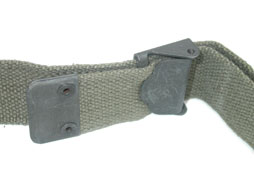 ODキャンバス製。金具はSG550と同じスイス軍用のグレー・グリーン色の焼付け塗装。スイス独特の長さ調整金具付き。使用はされていますが、銃に取り付けるアクセサリーとしては耐久性は十分あります。 |