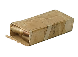 オリジナルの紙箱に入った十四年式拳銃実包(8mm南部拳銃弾)ダミーカート15発セットです。 弾頭は全て銅被甲となっており、雷管は打撃痕のある使用済で内部に火薬等一切入っていない安全品です。 薬莢の側面には安全処理のため直径3mmほどの穴が開口されています。 紙箱表面には「十四年式拳銃實包 十五發」の文字と東京第一陸軍造兵廠を示すの星に二重丸のマーク印刷されています。 箱裏面には「昭20.2」の製造年月のスタンプがあります。 箱全体にセロテープ(透明)が巻かれてあり、箱の側面(最も小さな部分)のみが切開されており、内部のダミーカートが取り出せるようになっています。 全体的にしっかりした美品です。 オリジナルの紙箱付きで資料性の高いセットになっています。 東京店在庫品 (TK) |