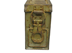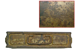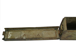 | ロック部側画像です。 34型弾薬箱からの改良点の1つで、34型が蓋上部にロック・レバーが付けられていたのに対し、41型はレバーが側面に取り付けられ、さらにロの字型の金具がロック部、本品は丁番側に加えられました。 |