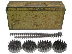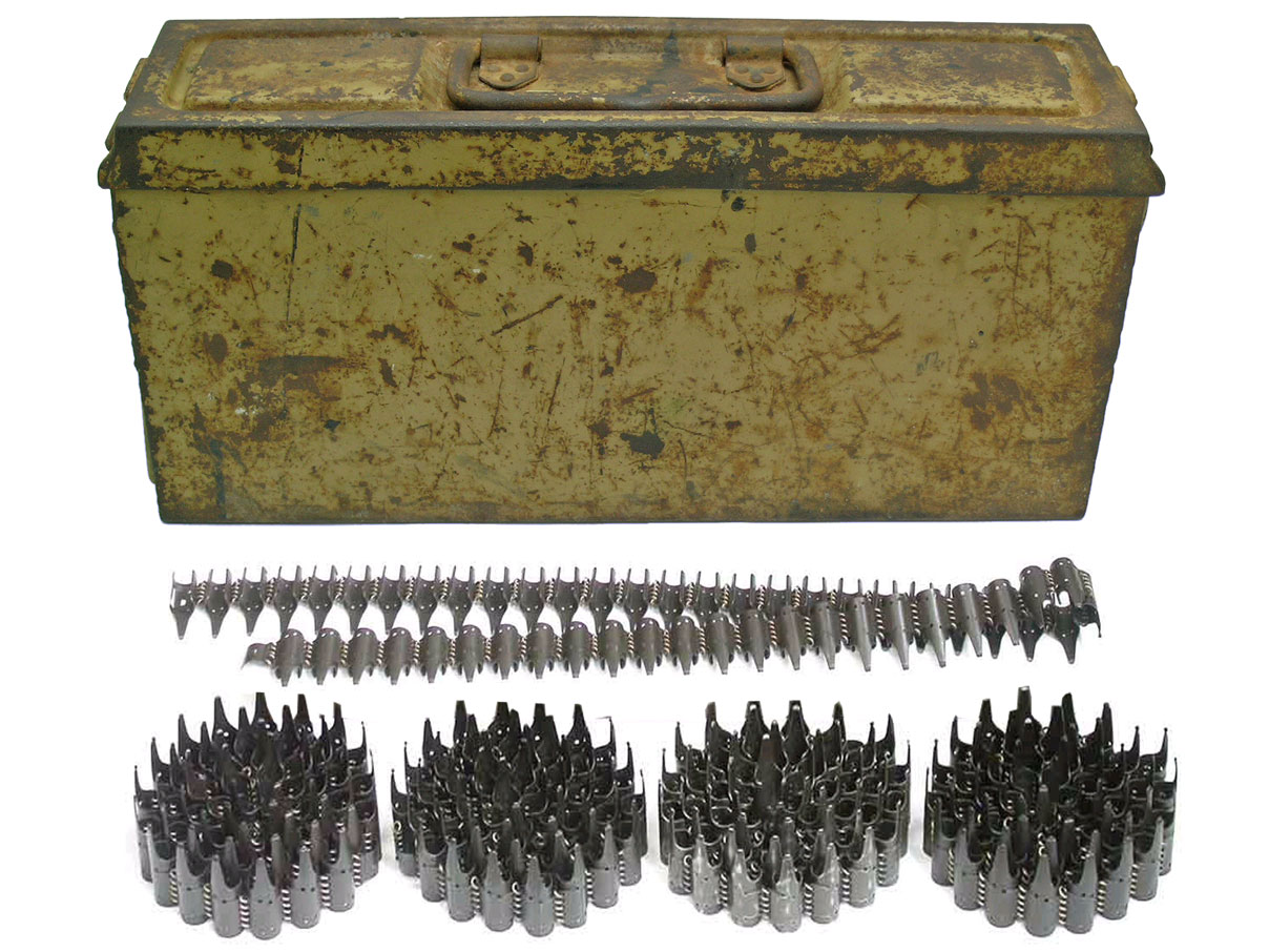 Patronenkasten 41(41型弾薬箱)。 オリジナルのタン・イエロー塗装が60%以上残ったオリジナル性の高い品です。 蓋に1944年bdk(Schneiderwerke GmbH,Saarbrücken-Werk社)製の刻印がはいっています。 蓋の側面のカットも34型の斜めから真っ直ぐの形状に、蓋と本体の連結部にロの字型の金具も追加されることで蓋がより低い位置にセットされ、安定性が増しました。 箱前側面に「Patr.kast.41f.MG」の形式名刻印が入っています。 刻印が入っていないアモべルト5本付(画像のアモ・ベルトは異なります)です。 MG42共用です。 300発用ですが、当時のマニュアルを参照すると弾薬を同方向へ収納する場合は250発まで可能で、300発収納する場合は100発ずつ交互に入れました。 |