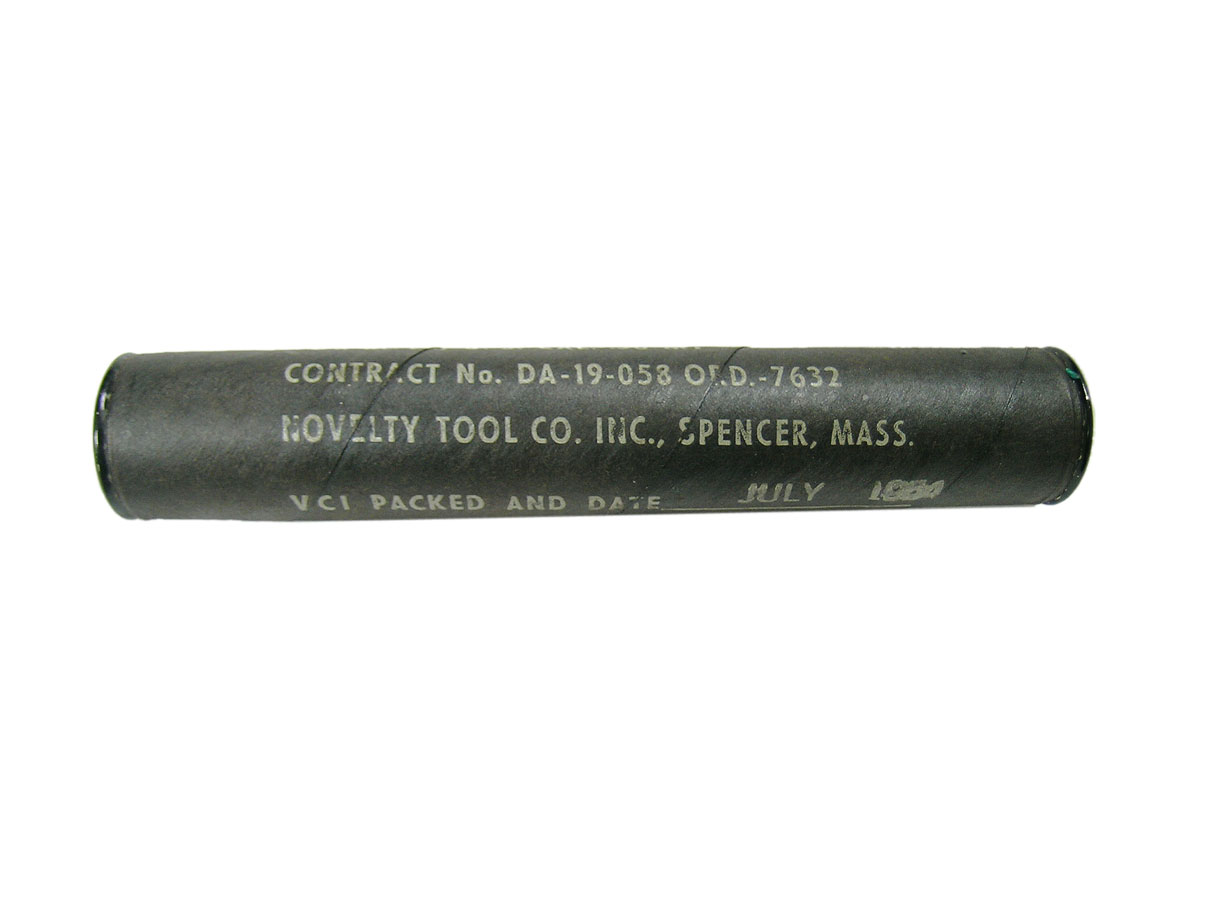 M1ガーランド用M10クリーニング・ロッドのオリジナル・チューブ型ケース入りです。 ガーランド用ですがM14ライフルをはじめ各.30口径の銃に使用することが出来ます。 今回入荷したものはオリジナルの未開封のチューブ・ケース入りです。 クリーニング・ロッドで年号が特定できるものは非常に珍しく、ロッドの形状的には大戦中の物と全く同様です。 |