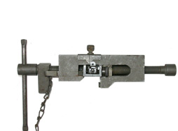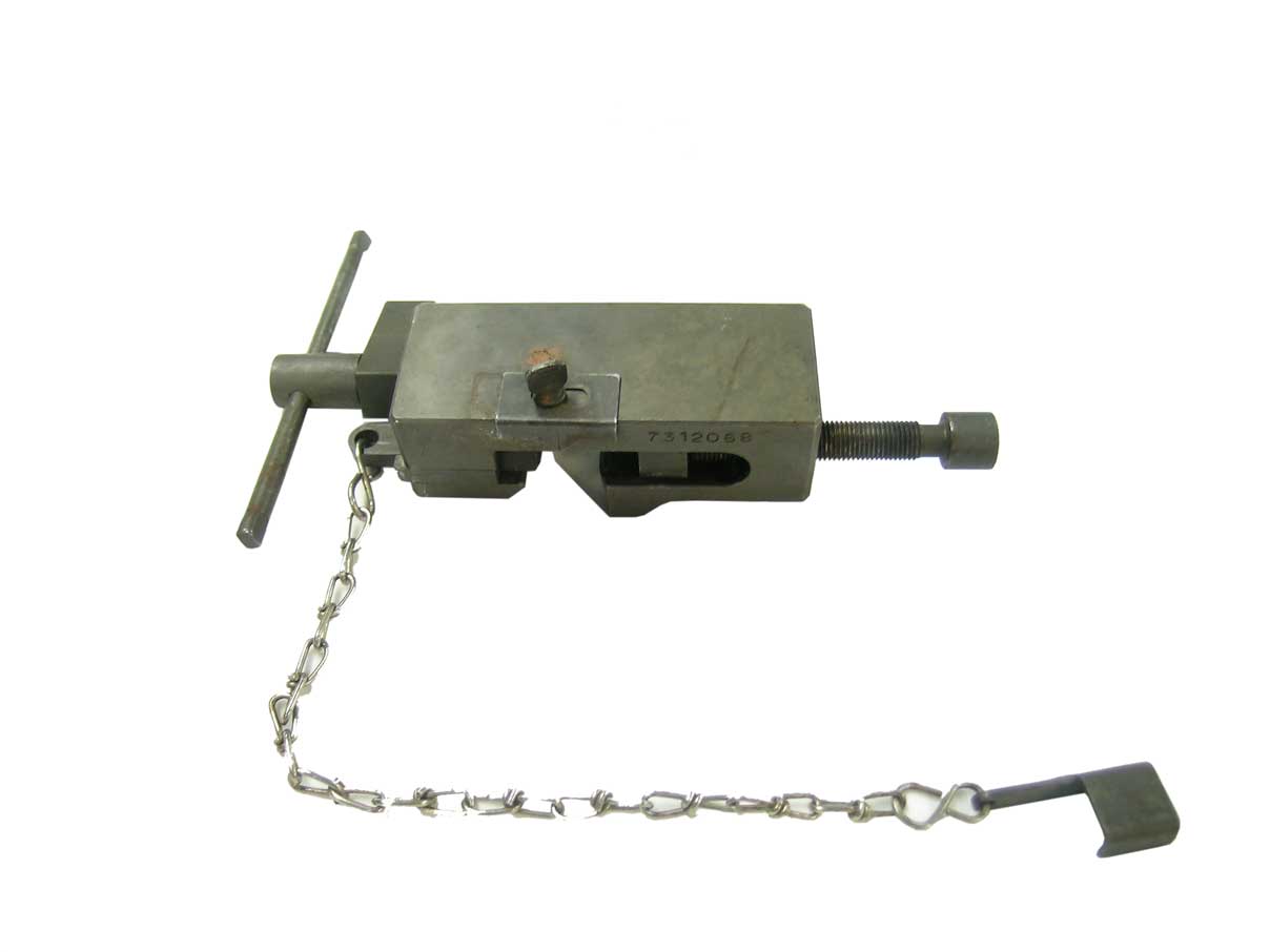 M1カービンのアジャスタブル・リア・サイト(削り出し、プレス・タイプ)の取付け、取外し用の専用工具(治具)です。 初期型のフリップ・タイプをアジャスタブル・タイプに乗せかえるために支給されていたものではないでしょうか。 アッセンブリー・ナンバーは7312068で使用方法がテクニカル・マニュアルTM9-1276(1953年)に掲載されています。 カービンのアジャスタブル・サイトは大戦中に開発・採用されていますが全体に付け替えられたのは戦後になってからのようです。 記録写真でも大戦中には見ることがありませんが朝鮮戦争ではすっかりかわっています。 本品は若干の鉄部の赤味、小範囲で塗料が付着した部分が見受けられますが、パーツの欠損も無くパーカライジングの表面も非常に綺麗なものです。 |
