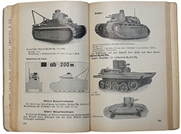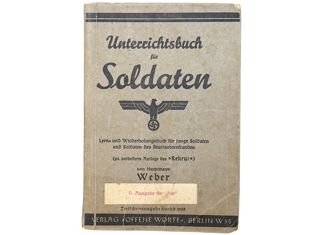 Unterrichtshsbuch fur Soldaten、1939年発行 全286頁 経年による染みや折れ、部分的な破れは見られますが、判読には影響がなく、きれいな状態を保っています。 礼儀作法や地図記号、銃器や兵器に関する解説が記載されています。 一部にカラーの頁があります。 東京店在庫品 (TM) |
