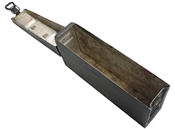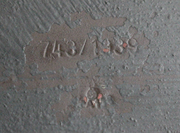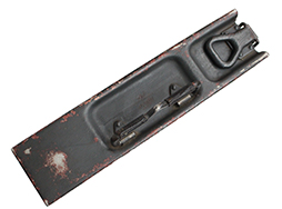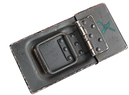 アルミ製の弾薬箱は、ペイントが落ちている箇所が多数見られ地金が目立つ印象です。所々に小さな凹みこそあるものの、機能的な問題は無く開閉はスムーズです。千切れやすい取っ手の革も残っています。 また、上部にはアムトマークと製造年の刻印が確認できます。