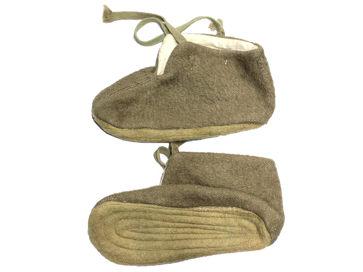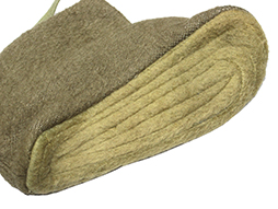 あまり目にすることの無い日本陸軍の防寒足袋一対です、厳寒地帯の部隊向けの装備と思われます。 所々に経年による剥げなどが見られますが、ほぼ未使用の品と思われ状態は良好です。 左右の内側に薄れて読めなくなっていますが検印らしき印が確認出来、サイズを示すと思しき「中」の縫い付けも見られますがサイズは約23cmほどとなっています。