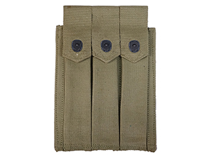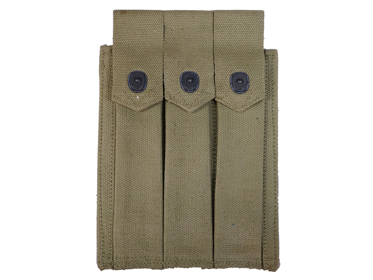 トンプソン 30連マガジン用のマガジン・パウチです。 パウチには30連マガジンを3本収納でき、カーキ・キャンバス製となっています。 裏面には「U.S.M.C.」のスタンプが見られ、海兵隊で使用されたことが分かります。 また、「R.M. CO. No-45412 1944」のスタンプも押されており、1944年製となっています。 キャンバス地特有の解れ等が僅かに見られるものの全体的なコンディションは良く、破れや大きな汚れも見られません。 金具部の錆も殆ど見られず、しっかりと蓋をすることができます。 個体によって若干状態が異なります。 東京店在庫品(YS) |