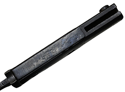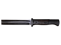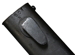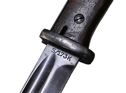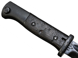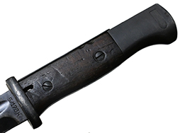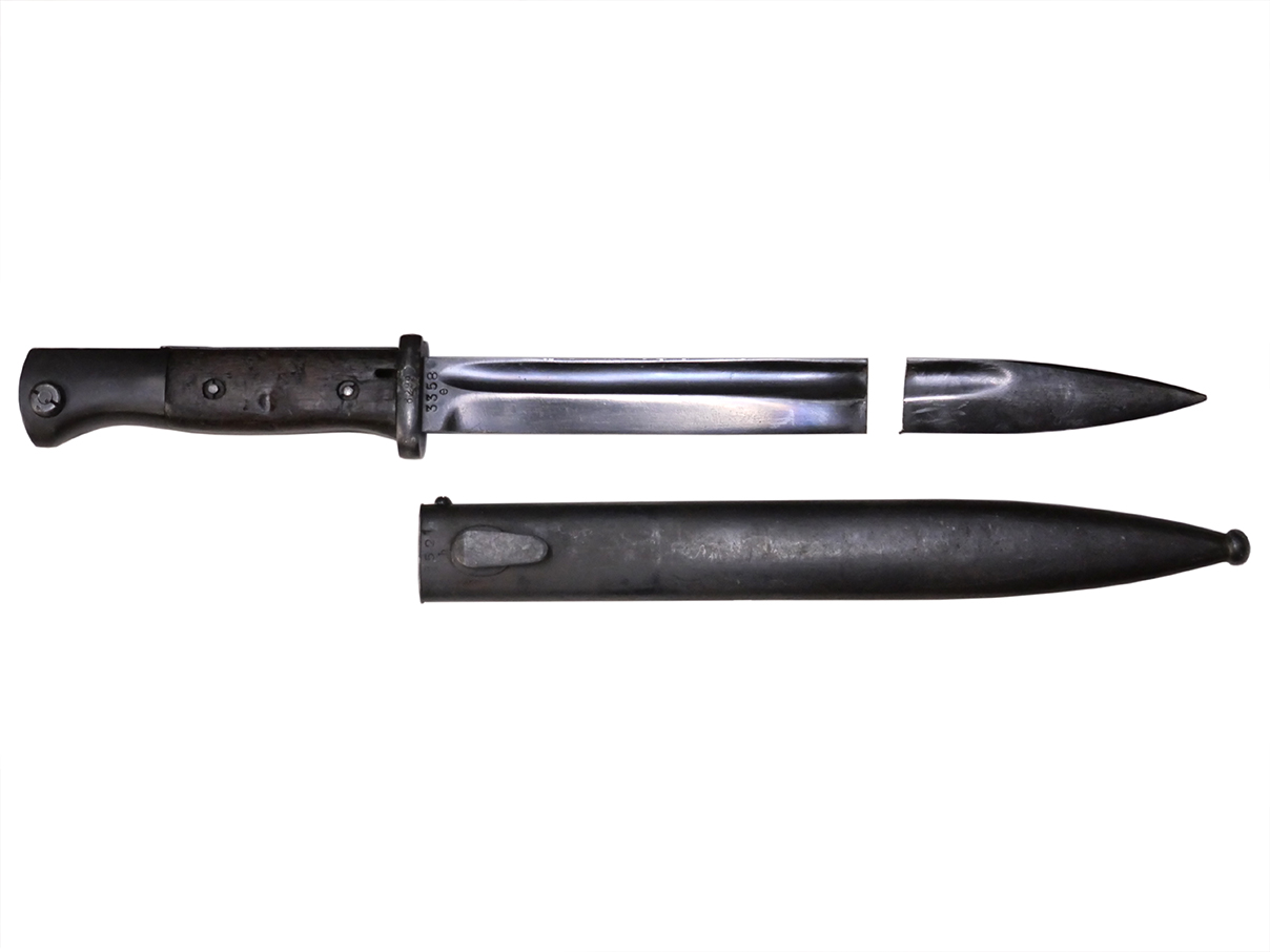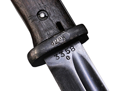 Kar.98k 銃剣です。 刀身は根元から14.5cm未満の位置で切断されており、切断済みの剣先が付属します。 刀身根元にはシリアルNo.3358e、裏面にはCopper GmbHで生産されたことを示す「S/173K」の数字コード(Zahlen code)が見られ、コードの末尾「K」から1934年製であることが分かります。 また、ガード(鍔)部分には8299の刻印が見られます。 鍔部分の革製の鞘受けは欠品しています。 鞘のシリアルは9521bで、「42 cof」のレターコードから1942年にCarl Eichhornで製造されたことが分かります。 銃剣本体には若干の小傷や擦れ、経年により表面仕上げの褪色が見られるものの、総じて大きな破損や欠損は見られません。 グリップ・フレーム上部の板に若干の打ち傷や変形が見られます。 木製グリップには若干の打ち傷や線傷が見られるものの、こちらも大きな破損は見られず、取り付けにガタつきは見られません。 鞘には表面錆痕が見られ、打ち傷に伴う凹みが見られますが、大部分で表面仕上げが残った状態が保たれています。 グリップ・フレーム、ロック・ボタン、鞘の石突部分にはアムト刻印が見られます。着剣装置のロック金具や鞘内部の板バネのテンションもしっかり残っています。 東京店在庫品 (TK) |