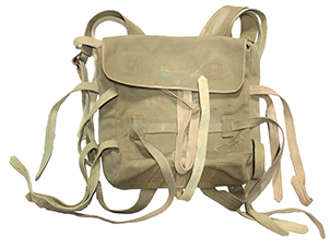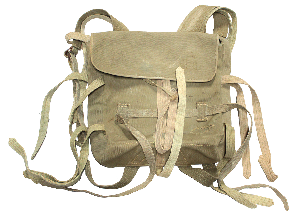 九九式背嚢は日中戦争、太平洋戦争において使用された日本軍の代表的な背嚢です。 蛸足背嚢と言うのは外套や飯盒、地下足袋、小円匙を括り付ける為の紐が多いことからきた俗称です。 今回の品は表側の右下側に少々目立つ補修痕や染み等の経年感は見られますが全体に確りとした状態で、検定印も鮮明で「昭和十七年製」「大支検定」等の文字が確認出来ます、また記名欄には記載はありません。 先に述べましたように一部補修痕などは見られますが紐の状態も良く、80年以上経過した割に全体に程度の良い品です。