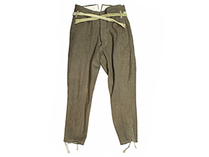 入隊すると官給品として支給された陸軍下士官兵用三式軍袴です。 内側には「三式、中号、昭和十九年製、廣支検定」などの検印が見られます、記名欄に記載はありません。 経年による褪色や擦れ等は見られますが、全体に程度の良い状態の品です。 裾紐、腰紐も完全です。
