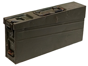 MG3に使用する金属製の弾薬箱です。 第二次世界大戦中のMG34/42用弾薬箱に類似していますが、使用弾薬の識別用に本体側面に2本のリブが入っていることが特徴です。 また、大戦型の弾薬箱と比べて薄い鉄板が使用されています。