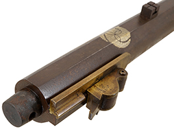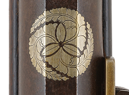本品は口径が実測17mmの八匁中筒で、本体重量は約◯◯kgとなっています。 本品の筒 (銃身) は後方に向かって緩やかに広がった丸銃身で、上面のみ平坦となった「表一角」と呼ばれる形状となっています。 銃身の上には作域の良い銀象嵌で「三ツ藤巴紋(みつふじどもえもん)」または「藤巴紋」が配されいます。 後藤又兵衛、大久保利通、福岡藩主黒田家の家紋などで有名です。 銃身と銃床は目釘ではなく1本の真鍮製台締金により確りと固定される構造となっています。