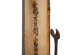 台木 (銃床) についても高級な樫を用いるなど贅沢な材料を使った品で、内部には「大嶋吉兵衛宗昌」の台師銘が入っています。 弊社では「大嶋吉兵衛宗昌」の銘が入った台木が付いた「摂州住嶌谷喜八郎」作の火縄銃 細筒と「江州國友戸十郎當節」作の火縄銃型 管打式軍用筒も取り扱っており、大嶋吉兵衛宗昌が堺及び江州国友の鉄砲鍛冶双方に台木を供給していた事が窺えます。 尚、國友戸十郎當節については文政七年 (1824年) から幕末頃にかけて活動していた鉄砲鍛冶である事から、同じ台師銘が入った本品の台木も同時期に製作された可能性が高いと思われます。 豪華絢爛な堺筒の台木から、装飾性を廃した質実剛健な国友軍用筒の台木まで幅広く手掛けていた大嶋吉兵衛宗昌は、当時相当の実力や技巧を備えた台師であったと考えられます。