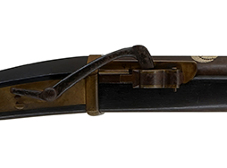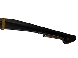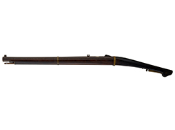台木 (銃床) については銘を入れるだけあって、台師にとっても自信作であったと思われます。 台木にはやや打ち傷や線傷が僅かに散見されますが、全く問題の無いレベルです。 銃身を外して台(銃床)の状態を見ると使用(実射)された形跡が殆どなく、160年以上経た時代感は感じられますが、しっかりとした状態が保たれています。 先台全体に角は完全に落とした丸みを帯びた形状です。 カラクリの地板や胴金、雨覆、火蓋、引金、ナマコ金といった真鍮部品についても、適度な時代感が付いた良い雰囲気となっています。 カラクリの作動については完全で、鉄製の火挟を起こした際のロックはしっかりと掛かり、引金を引くと火挟がスムーズに落ちます。 火蓋の開閉についても問題なく行うことが可能です。 銃身内は銃口から銃身後部まで完全に抜けて (通って) おり、火穴も抜けています。 尾栓については現状固着しており取り外しは出来なくなっています。 木製のかるか (さく杖) が付属致します。