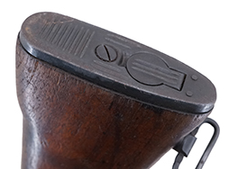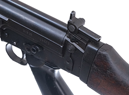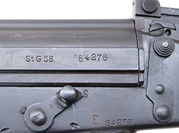 本品はアッパー・レシーバー右側面に「STETR-DAIMLER-PUCH A.G.STEYR LIZENZ FN」のメーカー刻印が打刻されていることから、オーストリアのステアー社でライセンス生産された品であることが確認出来ます。 レシーバー左側面には「StG 58」のモデル名刻印に加えてシリアルNo.54276が打刻されており、このシリアルNo.はアッパー・レシーバーとロア・レシーバー、ボルト・キャリアでマッチしています。 尚、レシーバー・カバーには「FN」の刻印が入っています。 セレクター表示は「S(安全位置)-E(単発)-D(連射)」の表記となっています。 本品は木製バット・ストックを備えています。