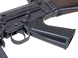 本品の金属部分は、やや打ち傷や擦れ、経年による褪色の他、一部若干の表面錆痕が見られるものの、目立った破損や欠損、表面錆等は見受けられず、オリジナルの表面仕上も比較的残っています。 木製バット・ストックには、やや打ち傷や線傷、一部古い補修痕が見られますが、現状大きな破損や欠損は見受けられません。 樹脂製グリップについても、やや打ち傷や線傷、擦れは見受けられるものの、こちらも大きな破損や経年劣化等は見られず、取り付けにも現状がたつき等は見られません。 バット・プレートにはやや打ち傷や経年による褪色の他、一部表面錆痕や朽ち込み痕が見られますが、現状大きな変形等は見られず、ストック内コンパートメントの蓋の開閉についても問題ありません。 マガジンの着脱や二脚の展開、リア・サイトの調整、レシーバーのテイクダウン操作についても問題なく行う事が可能です。 セレクター・レバーの切り替えについても問題なく、安全位置でトリガーがロックされます。 付属のマガジンは若干の小傷や擦れ、僅かな表面錆は見られるものの、目立った凹みや変形等は見られず、比較的良好な状態が保たれています。