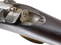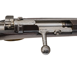 本品の機関部左側面前部にはシリアルNo.73033が打刻されており、後部には「I. G. Mod.71.」のモデル名刻印が打刻されています。 また、銃身基部には改修を行ったSociété Française d’Armes Portatives (SFAP) を示す「S.F.A.P St Denis」の刻印が入っています。 機関部右側面前部には王冠とアルファベットを組み合わせた検査刻印が3箇所打刻されており、後部には製造年を示す「1872」の刻印が打刻されています。 製造年の左には「82」の刻印が確認出来ますが、これはおそらく1882年に工廠で再検査もしくは整備が行われた事を示す刻印と思われます。 シリアルNo.は、機関部、ボルト、ボルト・ストップ用ネジ、コッキング・ピース、セーフティが(73)033でマッチしており、バット・プレートは75320となっています。 各部のネジについてはシリアルNo.は異なっています。