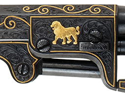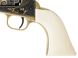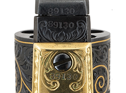本品は非常に手の凝った再仕上げで、有名なエングレーバー(彫刻師)である井浦勝雄先生の代表的な作品です。 井浦先生は実銃のエングレービングを専門としておられ、1970年代には米国で実銃に彫刻を施されていた経験のある「銃の彫刻家」の第一人者です。 本個体にはオールド・アメリカン・スタイルの彫刻が入れられています。 先生の作品中にもグレードがあり、動物などのアクセントを純金(24k)象嵌で施した品が高級な品となっています。 本品には右側面に「アメリカン・イーグルと呼ばれる白頭鷲」、右側面に「雄ライオン」の金象嵌が施されています。 本品はこの再仕上げを施した状態で令和7年の登録審査に合格した作品です。 念のために当該教育委員会の確認を取ってあります(単に登録証の記載部分の確認だけではなく、彫刻についての確認済です)。 弊社でもこのような状態での登録証付きの品は初めて(同時入荷のポケットとネービーの計2挺)入手致しました。また両品共に象牙のグリップが付けられています。 全ての教育委員会で同じ結果が出るとは考えてはおりませんので、今回は特別に井浦先生の作品の卓越した技量による美術的価値が認められた結果と判断しています。 日本人で米国で通用する(それ以上の腕がある)彫刻師である事に、心より敬意を表します。