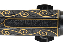 本品のシリアルNo.は銃身、フレーム、トリガー・ガード、バック・ストラップ、シリンダー、シリンダー軸(下4桁)、ローディング・レバー(下3桁)でマッチしています。 尚、バレル・ウェッジにはシリアルNo.は入っていません。 本品のシリンダー表面には駅馬車 (Stagecoach) 強盗のロール・エングレービングに置き換えて本体の彫刻に合わせた唐草模様の彫刻が新たに入れられています。 シリンダーの「COLTS PATENT」のパテント刻印についてはシリアル共々明確に判読できます。 フレームの左側面の「COLTS PATENT」の刻印についても、明瞭に確認出来ます。