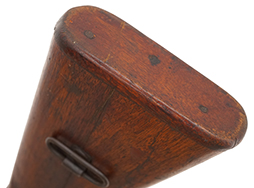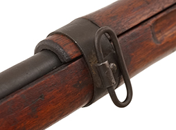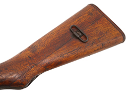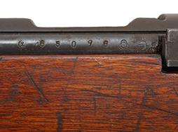 本品は九九式短小銃 末期型 (東洋工業製) です。 東洋工業は民間企業ですが、初期の段階から九九式の生産へ参加しており、名古屋、小倉工廠に次いだ生産数を誇りました。 機関部側面にはシリーズ<エ>及びシリアルNo.65096に加えて東洋工業製を示す刻印が打たれており、昭和19年7月頃から12月頃の間に生産された品である事が判ります。 末期型では基本的に薬室上部の「九九式」の刻印は省略されています。 菊花紋章ははっきりと残っています。 槓桿は楕円形で、安全子は溶接痕の有るタイプとなっています。 その他の仕様としては、照星はガードが無い仕様、木被は下帯までの短縮型、床尾負革止はネジ1本により固定されるタイプ、床尾板は木製となっています。 また、さく杖の取り付けは出来ない仕様となっています。