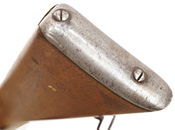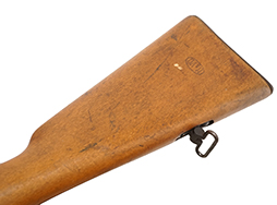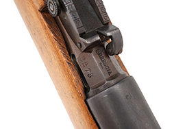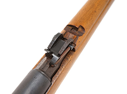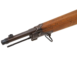 本品の銃身や機関部といった金属部は、若干の打ち傷や擦れの他、一部に表面錆痕が見られるものの、目立った欠損等は見られず、表面仕上げも比較的良好に残っています。 白磨きのボルトについても、若干の時代錆や表面錆痕は見られますが、こちらも現状目立った欠損は見られません。 木製銃床についても、やや打ち傷や線傷が散見され、トリガー・ガードやアッパー・タング周辺の木部に僅かなヘアライン・クラックが見られるものの、こちらも大きな破損は見られず、コンディションは概ね良好です。 バット・プレート部については、やや時代錆や表面錆痕は見られるものの、目立った変形等は見られず、銃床への取り付けもがたつきもなくしっかりとしています。 リア・サイトの調整については問題なく行う事が可能です。 クリーニング・ロッドが付属いたします。