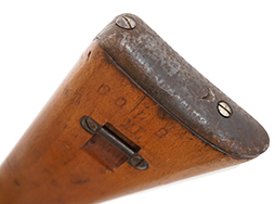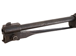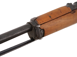 本品の銃身や機関部といった金属部は、やや打ち傷や擦れ、若干の表面錆痕が見られるものの、目立った欠損等は見られず、表面仕上げも比較的良好に残っています。 木製銃床については、若干の打ち傷や線傷が散見される他、リア・サイト付近の銃床左側面に一部表面的な欠けが見受けられ、バット・ストック後端にも若干のヘアライン・クラックや部分的な欠けが見られるものの、全体としては大きな破損等は見られず、概ねしっかりとした状態が保たれています。 アッパー・ハンドガードに一部補修痕が見られます。 傷み易いバット・プレートについても、やや時代錆や表面錆痕は見られるものの、目立った変形等は見られず、銃床への取り付けについてもがたつきもなくしっかりとしています。 尚、さく杖は付属致しません。 付属の銃剣は基部の見えない箇所で溶接により折り畳んだ状態で固定されており、起剣操作は出来なくなっています。
