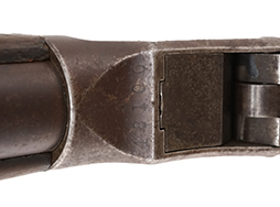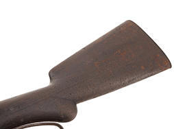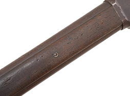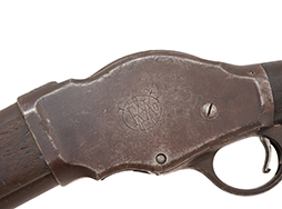 本品はシリアル No.48100で、アンダー・レバーに隠れるロア・タングには「MANUFACTURED BY THE WINCHESTER REPEATING ARMS CO. - NEW HAVEN. CONN. U.S.A. - PAT. FEB. 16. & JULY 20. 1886」の刻印が入っています。 その他、機関部左側面にはウィンチェスター・リピーティング・アームズの頭文字を意匠化した大きな刻印が打たれています。 加えて、一部薄くなっているものの、銃身基部上面には口径を示す「10」の刻印が打たれています。 この口径の表示方法はシリアル30,000番以降に見られる特徴とされており、本個体のシリアルNo.とも特徴が一致しています。