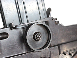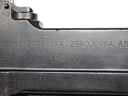 本品の機関部左側面には、「CESKOSLOVENSKA ZBROJOVKA, AS BRNO.」のメーカー刻印が二行にわたって入っている他、機関部右側面には「KULOMET ZB VZ.26.」のモデル名刻印が入っています。 大きなライオンの国章とレシーバー後端上部に「E」と極小のライオン、製造年を示す「36」の数字を組み合わせた刻印が小さく入っています。 レシーバー上面にはシリアルNo.2138が入っています。 またレシーバー下面の後端には☆に69と思しき刻印が見られバット・ストック左側面には4311と打刻されています。