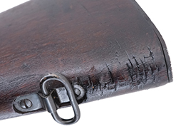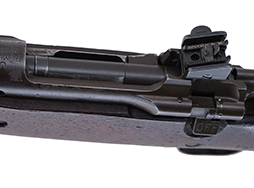 本品の機関部や銃身といった金属部はやや小傷や擦れ、錆の跡が見られるものの、目立った欠損は見受けられず、パーカー仕上げも大部分に残った比較的良好な状態が保たれています。 木製銃床については、やはり細かな打ち傷や線傷が散見されるものの、現状目立った割れや欠けなども見られず、こちらもコンディションは概ね良好です。 バット・プレート部についても若干の打ち傷や擦れを除いて目立った変形等は見られず、ストック内コンパートメントの開閉についても問題なく行う事が可能です。 リア・サイトの調整については問題なく行う事が可能です。