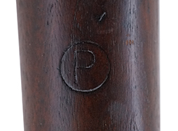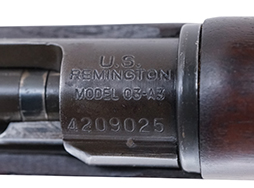 本品の銃本体はスミス・コロナ社製で、薬室上面にはシリアルNo.の他、「U.S. REMINGTON MODEL 03-A3」のモデル名刻印が入っています。 本品はシリアルNo.から1942年に製造された個体である事が窺えます。 銃身の刻印は1943年12月レミントン社製を示す「RA 12 43」となっており、レシーバーの生産時期とマッチしています。 トリガー上方の銃床左側面には1942年から1946年にかけて陸軍のロチェスター兵站管区で調達を担当していたFrank J. Atwood中佐のイニシャルを示す「FJA」の検査官刻印や、米国武器省 (Ordnance Department) の検査刻印であるクロス・キャノンの刻印が入っています。 また、銃把前面には「P」のプルーフ刻印が確認出来ます。