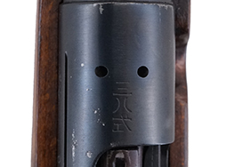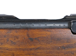 本個体は三八式騎兵銃 初期型の東京砲兵工廠 (小石川) 製です。 東京砲兵工廠では1923年 (大正12年) の関東大震災により甚大な被害を受け、一部機能を残しその役目を小倉工廠に移すまで生産されました。 初期型の東京砲兵工廠 (小石川) 製は、非常に丁寧な仕上がりで、検査刻印が多数打刻されているのが特徴的です。 本品の機関部左側面にはシリアルNo.0024265に加えて東京砲兵工廠製を示す刻印が入っています。 尚、シリーズ刻印は入っていません。 薬室上面の「三八式」の刻印ははっきりと残っていますが菊花紋章は完全に見えなくなっています。