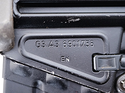 本品のマガジン・ハウジング左側面にはシリアルNo.6901756の他、「G3 A3」のモデル名や英国エンフィールド造兵廠で組み立てられた事を示す「EN」の刻印が入っています。 セレクター表示については、「S (安全位置) - E (単射) -F (連射)」のアルファベット表記となっています。