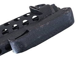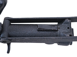本品の本体にはシボ加工の表面処理が施されており、一部シボ加工の剥落が散見されるものの、大部分が良好に残っています。 樹脂製グリップについても打ち傷は比較的少なく、概ね良好なコンディションが保たれています。 折り畳み式ストックの展開・折り畳み操作やリア・サイトの切り替え、マガジンの着脱については問題なく行う事が可能です。 付属のマガジンは若干の小傷や擦れは見受けられるものの、目立った変形等は見受けられず、こちらも総じて良好な状態が保たれています。 尚、マガジン・スプリングは入っています。 トリガーとの連動等は有りませんが、セレクター・レバーの切り替えは可能です。