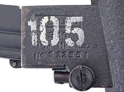 本品のシリアルNo.はS22551で、マガジン・ハウジング上面にはシリアルNo.の他、「STERLING SMG 9M/M MK4 (L2A3)」の刻印が入っており重ねるように「105」のペイントが施されています。 また、マガジン・ハウジング下面にはやや読みづらいもののスターリングのパテント刻印も入っています。 セレクターは「A-R-S」のアルファベット表記です。