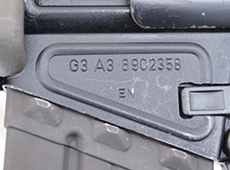 本品のマガジン・ハウジング左側面にはシリアルNo.6902358の他、「G3 A3」のモデル名や英国エンフィールド造兵廠で組み立てられた事を示す「EN」の刻印が入っています。 セレクター表示については、「S (安全位置) - E (単射) -F (連射)」のアルファベット表記となっています。