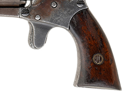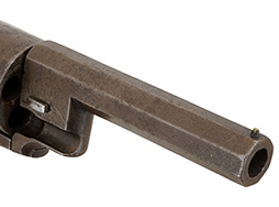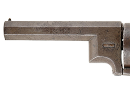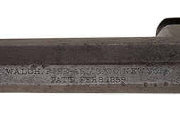 本品はウォルチ・リボルバーの中でも小型のポケット・モデルで、.31口径で5つの薬室を備え、装弾数は10発となっています。 ポケット・モデルのため、携行性を重視してローディング・レバーは当初から備えておりません。 トリガーは一本のみで、シーケンシャル・トリガー方式により作動し、2本のハンマーがトリガーを引く量に応じて右側から順番に撃発を行います。 尚、本品はフレームが鉄製のモデルとなっています。 本品の銃身上面には「WALCH. FIRE-ARMS. CO. NEW YORK」のメーカー刻印及び「PAT'D. FEB.8.1859」のパテント刻印がニ行にわたって打刻されています。 グリップを取り外したグリップ・フレーム左側面には1629のシリアルNo.が打刻されています。