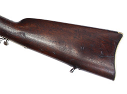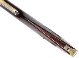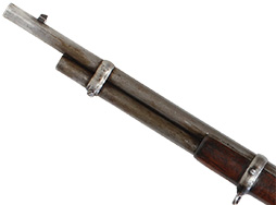 M1866には銃身長が27インチのマスケット、24インチのライフル、20インチのカービンがありました。 本品はそのマスケット(歩兵銃)モデルです。 通常のライフルやカービンと異なり、木製ハンドガードで覆われた部分より銃身先端だけ(チューブ・マガジンも短い)が約10cmほど出ており、そこにソケット式のスパイク銃剣を装着出来るようになっています。