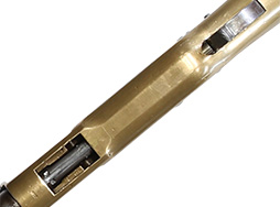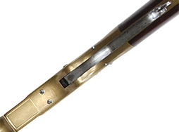 幕末に日本にもイエローボーイは少数が輸入されましたが、このマスケット・モデルは輸入された記録はありません。 日本語では「直動鎖閂式(ささんしき)銃」と呼び、同じレバー・アクション式の「底碪式(ていがんしき)銃」と混同されやすいが、遊底(ボルト)が(回転することなく)前後するので「直動鎖閂式」になり、ブリーチが上下する「底碪式」とは構造的には全く異なるものです。 (MM)