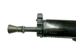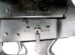 本品はフル/セミの切り替えが出来るセレクティブ・ファイア・モデルで刻印もAR18となっています。 ショート・バレルにした為に大きくなった反動を抑える為のラッパ型サプレッサーが付属しています。 またハンドガードには元々バーティカル・グリップが付いていた物を取り外した形跡があります。 珍しいブルー仕上げのスターリング社製オリジナル30連マガジンが付いています。 フロント・バントに付いていたスリング・スイベルが欠損している以外には大きな傷等もない程度の良い品です。 ボルトが完全に閉鎖した旧加工品です。大阪店在庫品