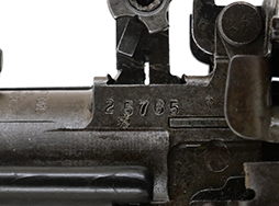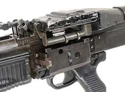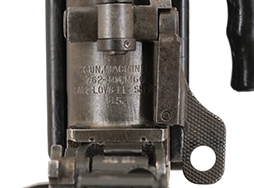 本品の薬室部左側面にはシリアルNo.25765の刻印が見られます。 また、薬室部上面のメーカー刻印は「SACO-LOWELL SHOPS U.S.」となっており、これは1957〜62年の生産品に見られる刻印です。 その他、モデル名刻印が「GUN, MACHINE 7,62-MM , M60」となっていることから、SACO-LOWELL SHOPS製のM60の中でも比較的初期に生産された個体と見られます。 各部の構成はバレル・キャッチ・レバーはロックが無い初期型、機関部左側面に100連アモ・バッグ(MAGAZINE 11686442) を装着する為のブラケットが付いた初期型で、セーフティー・レバーも削り出しの初期型となっています。 その他の箇所では、フロント・サイト・ポストの肉抜き穴部分にブランク・ファイアリング・アダプター装着用の面が設けられた後期型、ハンド・ガードはスイベルが左側面にある後期型、バット・ストックはスイベルが上面にある後期型、二脚基部が削り出しの後期型となっています。