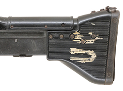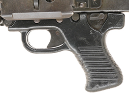 本品はベトナムからの放出品で、全体的にやや使用感が見受けられるものの、概ねしっかりした状態が保たれています。 金属部には一部仕上げが落ちて金属の地肌が表れている箇所や表面錆痕等が見受けられるものの、いずれも大きな欠損は見られません。 ヒート・シールドや機関部周辺の表面仕上げには褪色が見られるものの、銃身周辺には比較的表面仕上げが残っています。 アルミ製のフィード・カバーは黒いペイント仕上げとなっており、表面にやや小傷や擦れ、若干の凹みの他、一部仕上げが落ちて金属の地肌が表れている箇所が見受けられるものの、大きく外観を損なうものではありません。 機関部左側面の100連アモ・バッグ装着用ブラケットは後方のキャッチが欠損しています。 ハンドガードやグリップには小さな欠けやクラックが見られるものの、現状割れが広がっている様子はありません。 ハンド・ガードとストックの取り付けには若干のガタつきが見られるものの、取り付け自体はしっかりしており許容範囲内といったところです。 バット・ストックには小傷や小さな欠けが見られるもののこちらも概ねしっかりとした状態が保たれています。 ストック左側面には白ペンキの文字が見られます。 傷みやすいバット・プレート部は、若干の打ち傷や擦れ、表面錆痕が見られますが、ストックとの取り付けはしっかりとしており、大きな変形やガタつきなどは見受けられず、ショルダー・レストの開閉についても問題ありません。