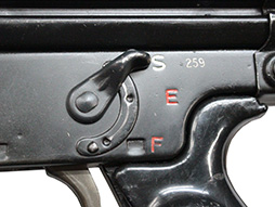 本品はパキスタンPOF製のGew.3A2 自動小銃で、マガジン・ハウジング左側面には「G-3 P.O.F 81」の刻印の他、シリアルNo.が打刻されています。 アッパー・レシーバー、ロア・レシーバー、ストック基部のシリアルNo.は全てマッチしています。 セレクター表示は「S (安全位置)-E (単射)-F (連射)」のアルファベット表記となっています。 本品のハンドガード及びバット・ストックは木製で、グリップは黒色樹脂製となっています。