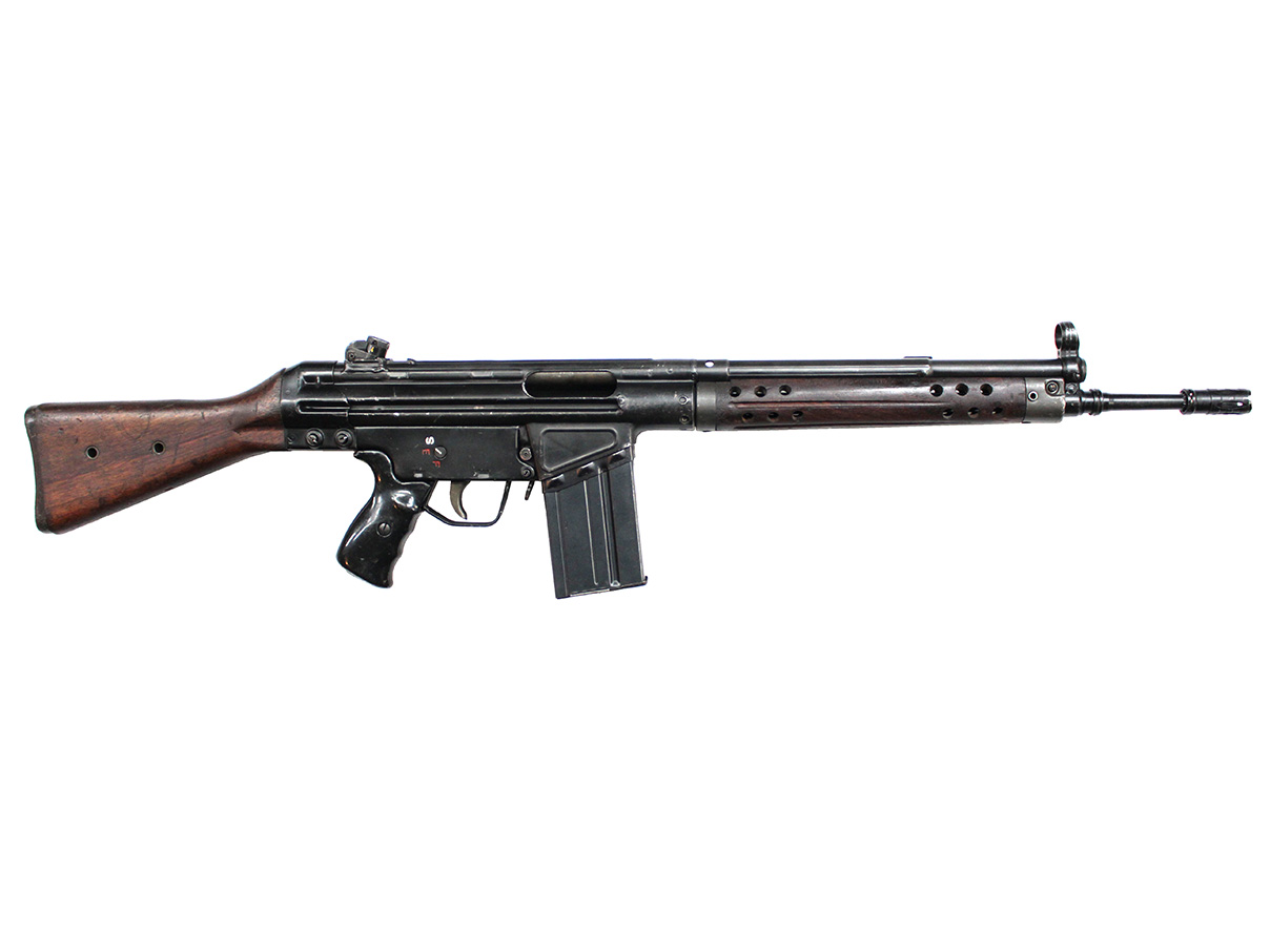 Gew.3自動小銃は、スペインで開発されたセトメ自動小銃の発展型で、1959年に西ドイツ連邦軍の制式小銃として採用された自動小銃です。 ローラー・ディレイド・ブローバック・システム等、多くの特徴的な機構を備え、西側を代表するアサルト・ライフルの一つとされています。 最初期生産モデルのGew.3自動小銃は、シート・メタル製のハンド・ガードや起倒式のリア・サイトが装備されていましたが、その後ハンドガードが木製に変更された他、リア・サイトについても1960年にドラム式に変更となりました。 Gew.3自動小銃はその後も更に改良が続けられ、1962年6月採用のGew.3A2では、ハンドガードやストックが樹脂製に変更となりました。