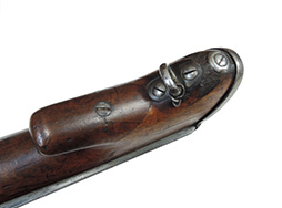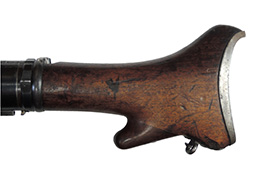 ブルーイング仕上げの金属部は、小キズ、スレなど使用感とフラッシュ・ハイダーや二脚などに銀地がやや多くでていますが、他の部分は総じてブルーも全体に残っており、時代を考えると大変状態の良い、美しい個体です。 木製のストックも同様に使用感が見られますが、ストック後方下部の飛び出した部分が如何にも地面に接触するために左右にやや抉れたキズと黒く変色しています。