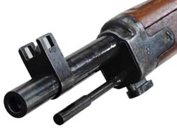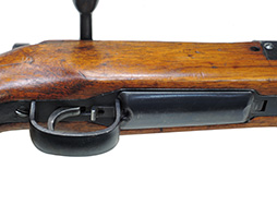 二式小銃は九九式短小銃を元に簡単に分離/結合が出来るようになっているので、外見は結合部以外全く同じです。 バット・ストックのスリング・スイベルの上部に太い溝があるのが唯一の違いです。 九九式短小銃初期型がベースで対空表尺は標準装備されていますが、一脚が付属している個体はありません。 結合部分は薬質の上に削り出しの頑丈なスリーブが付いており、レシーバー径より一段高くなっています。 この部分に菊花御紋章と二式の刻印が打ってあります。 前後を留めるのは一本のボルト型の楔(クサビ)で、結合部右側面から抜き差しする構造で、楔は紛失防止のために完全に抜け落ちません。 楔の頭部分の根元にネジ山が切ってあります。 その楔の頭部分に半月状のリングが付いており、これをつまんで一回転半から二回転強させて右側に楔を抜きます。 本体の前後はこの楔だけで固定されおり、楔を抜くだけで前部を前に抜いて分離させます。