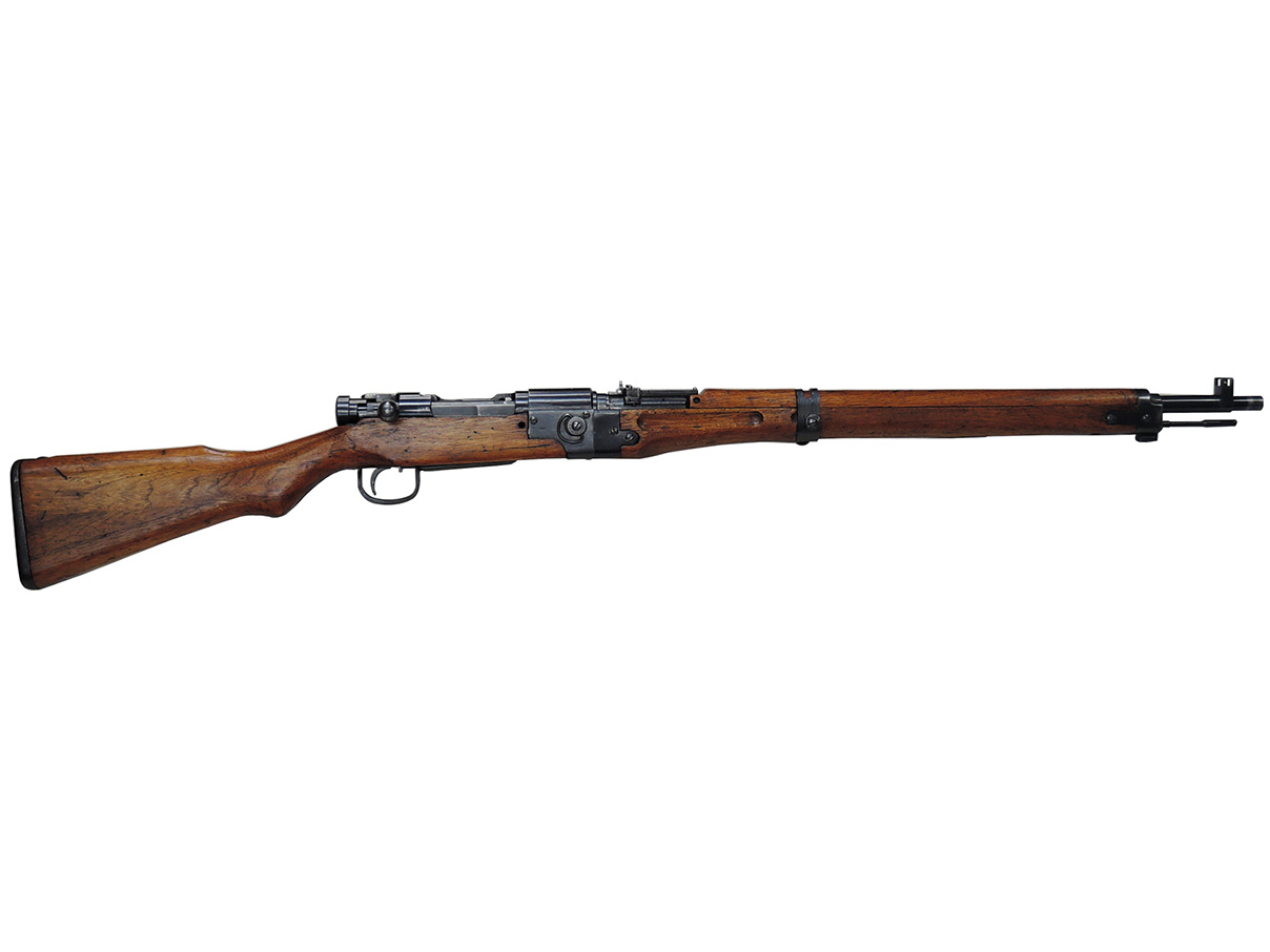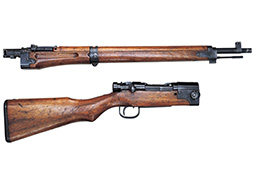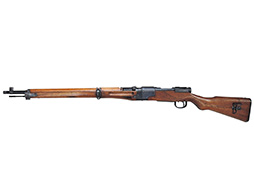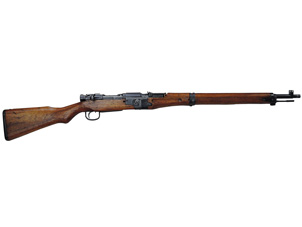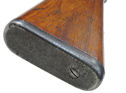 本品は名古屋造兵廠製で「二式」の刻印と菊花御紋章もはっきりと残っています。 残念な事に御紋章には鋭利な刃物で切り付けたような二重線が入っています。 これは日本軍が武装解除の際に御紋章が付いたままで敵軍に渡せないのでとっさに銃剣等で御紋章に付けたものと思われます。 しかし御紋章ははっきりと残っているので、これも歴史の一部と考えれば傷(欠点)にはなりません。 レシーバー左側面に名古屋造兵廠の刻印とシリアル No. が入っています。 トリガー・ガード前部の木部の小さな欠け、バット・ストックの小さな当り傷、バット・プレートの錆、フロント・バンドにブルーの仕上げ落ちがありますが極美品と言えます。 分解しなければ判りませんがハンドガードのセンター・バンドからフロント・バンドまで縦に長く細いヒビが入っています。 銃本体にハンドガードが付いている状態ですと殆ど判りません。