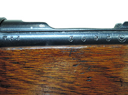 二式小銃だけに打たれている三桁のシリアルNo.(管理番号?)は「784」で前部結合金具、後部結合金具、レシーバー、ボルト型の楔に打ってあり全てマッチしています。 フロント・バンドのシリアル No.はレシーバーと一致しています。