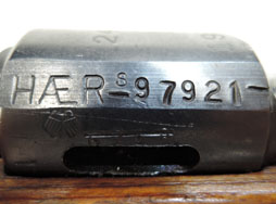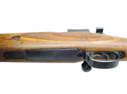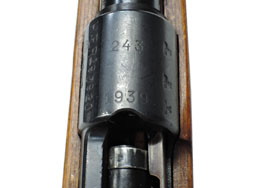 本品の銃身及び機関部はノルウェー駐留ドイツ軍が終戦時に同地に残していった品で、戦後ノルウェー軍によって7.62mm (.30-06) 口径にリバレル及びリチャンバーが施された仕様となっています。 そのため、薬室の一部に小さな切り欠きが見られ、銃身にも「KAL 7,62 M/M」の口径表示刻印が追加で打刻されています。 薬室部左面にはノルウェー軍によって打刻されたシリアルNo.97921が入っており、本来のシリアルNo.は横線の追加刻印で消されています。 薬室上面には「243 1939」の刻印が入っている事から、本品の機関部が1939年にモーゼル社で製造された事が判ります。 各部のシリアルNo.は、ボルトが273、ボルト・スリーブが6758、セーフティ・レバーが2192、コッキング・ピースが8054、トリガー・ガード、弾倉底板、フロント・バンド、リア・バンドは2670、リア・サイト・リーフが581、バット・プレートが打ち直しにより74032となっています。 銃床はラミネート製で、バット・プレートについてはフラット型、フロント・バンドはH型のタイプが取り付けられています。