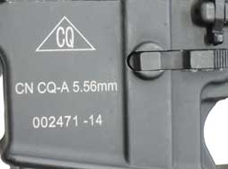 本品のマガジン・ハウジング左側面には、三角形の中に「CQ」の文字が入ったロゴの他、「CN CQ-A 5.56mm」のモデル名刻印やシリアルNo.刻印が入っています。 外見上は米軍用と大差はなく、伸縮式のストックを初め非常に高いクオリティの品です。 また、銃身長についても14,5インチとなっています。 セレクターは「SAFE-SEMI-AUTO」の表記となっています。 着剣ラグ下面に本体とマッチした2471のシリアルNo.が入っています。