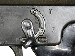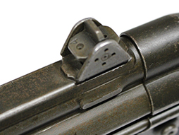 本個体はシリアルNo.42823の品で、セレクターはT、S、Rの表記で、マガジン・ハウジング左側面にはモデル名と口径、シリアルの刻印、さらにサンタ・バーバラ造兵廠のマークである剣の刻印があります。 リア・サイトはフリップ式となっています。